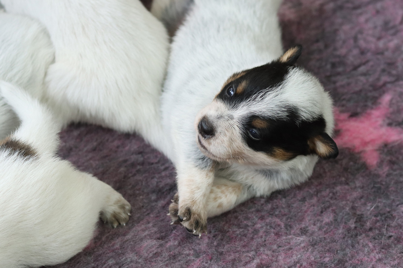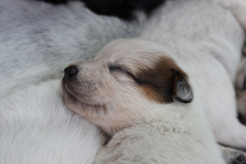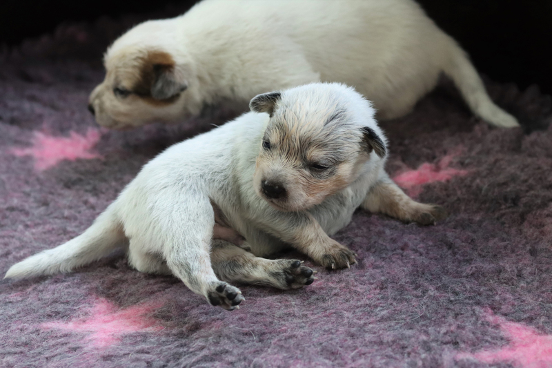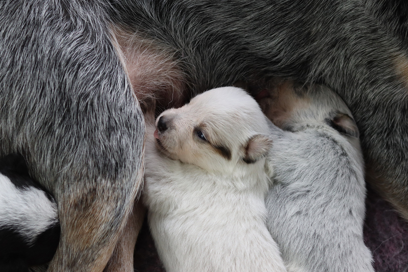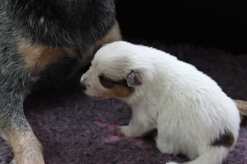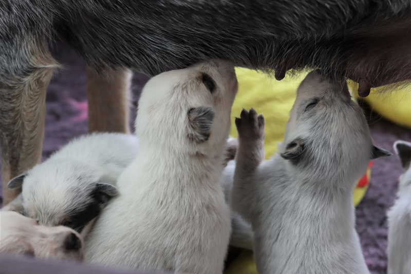 Nun sind die Kleinen schon 1 Woche alt. Sie sind sichtlich gewachsen und ihre Körper sind jetzt wohl gerundet. Alle haben heute ihr Geburtsgewicht verdoppelt. Kein Wunder, dass ich sie gern liebevoll als kleine Fressmaden bezeichne. Kali macht ihren Job als Mama mehr als souverän. Die Welpen sind immer blitz blank geputzt, was ja auch wichtig ist, da sie ohne die Bauchmassage von Kalis Zunge noch keinen Kot und Urin absetzen können. Auch mit Fanta und Brezel läuft es prima. Kali toleriert es problemlos, dass die Beiden mit im Wurfzimmer sind. Die Beiden sind aber auch sehr respektvoll und halten immer einen Abstand zur Wurfkiste.