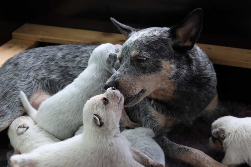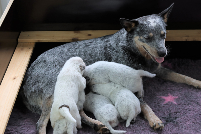 Schon mit Spannung erwartet, der Startschuß von Kali zur Geburt. Mittwoch Abend gab es dann plötzlich erste Anzeichen. Kali wurde sehr unruhig, hechelte immer viel und war immer wieder damit beschäftigt unser Wurfhöhlensystem im Garten zu erweitern. Ich war ständig an ihrer Seite, aber ein echter Fortschritt wollte sich nicht einstellen. Nach einer durchwachten Nacht, zog sie das Programm auch noch den ganzen Donnerstag durch und bescherte mir eine weitere Nacht ohne Schlaf! Langsam war ich auch schon etwas in Sorge. Gefühlt alle 5 Min habe ich gefühlt, ob sich die Welpen noch bewegen, aber ja, die feierten Party. Und dann endlich um 3.30 h der erste Pressversuch. Um 4.48 h hat sie dann den ersten Rüden geboren. Kali zeigte sich 100 % instinktsicher. Zerriss sofort die Eihülle, nabelte ab und leckte den Welpen. Ich war im 7. Himmel vor Erleichterung! Die nächsten 3 Welpen hat sie dann unglaublicherweise in nur 10 Min. zur Welt gebracht. Dann ließ sie es etwas lansamer angehen und um 8.22 h wurde das letzte Baby geboren. Ich bin so stolz auf meine kleine Kali! 7 Welpen! 3 Rüden und 4 Hündinnen in rot und blau. Alle agil und munter. Den Rest des Tages haben wir dann alle komatös verschlafen!